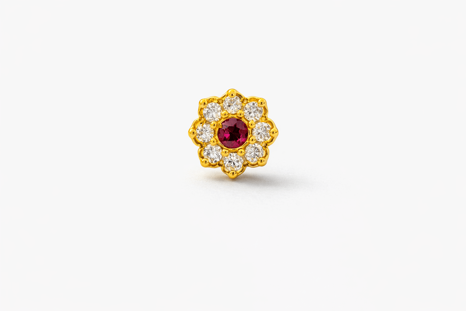 14ct Gold Ruby Flower Halo Stud | Solid Gold Piercing Jewellery